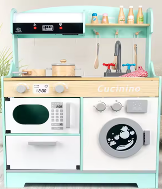 • Dual-Zone Play Experience: The upper level serves as a gourmet kitchen with a stovetop and prep area, while the lower level features a realistic front-loading washing machine and a built-in microwave, offering two distinct play environments in one sturdy piece.