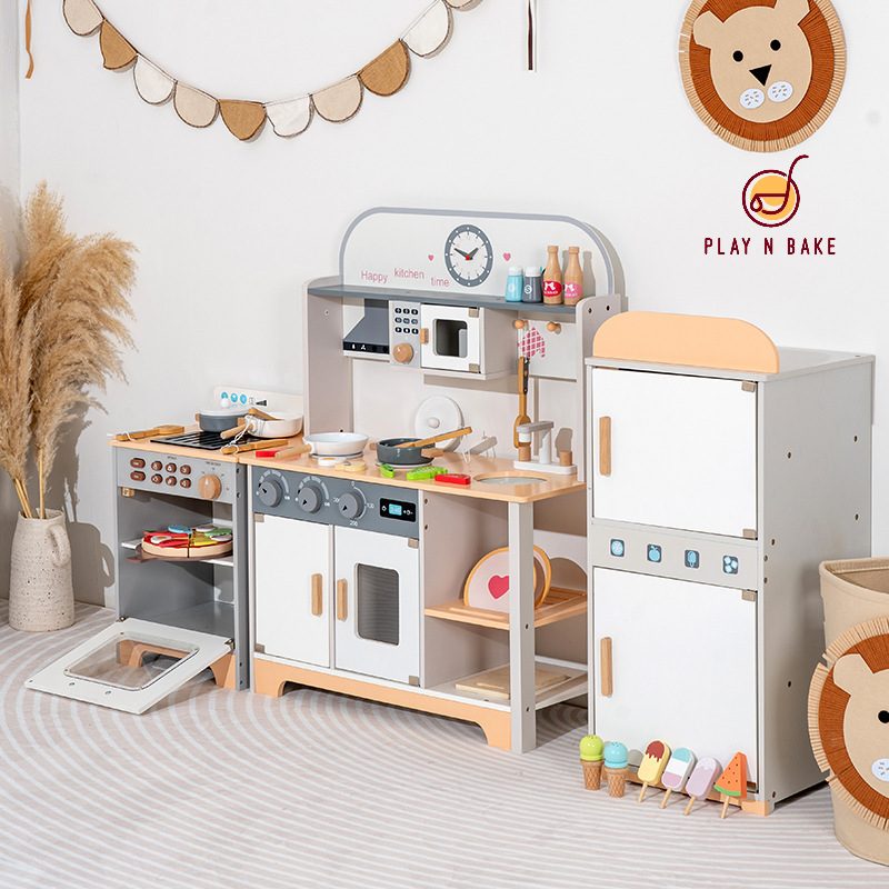 Ignite your child’s imagination with this magnificent, multi-functional 3-Piece Modular Wooden Play Kitchen and Laundry Set by PLAY N BAKE. Designed for the modern little chef and homemaker, this premium set combines a full kitchen, a dedicated washing machine, and a separate refrigerator into one flexible, engaging playscape. The light wood and pastel accents create an attractive, heirloom-quality piece perfect for any playroom or nursery.